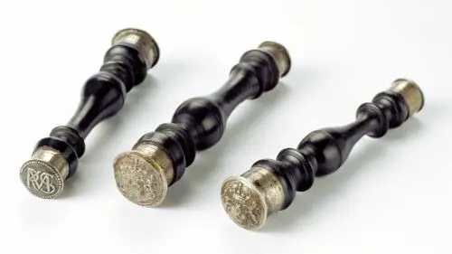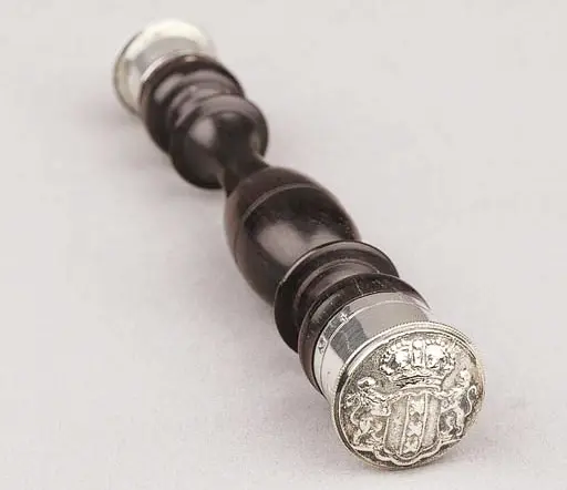 De stokjes werden gebruikt tot circa 1850. In de kleine zilveren dop staan de naam van de makelaar en het jaar van de beëdiging.